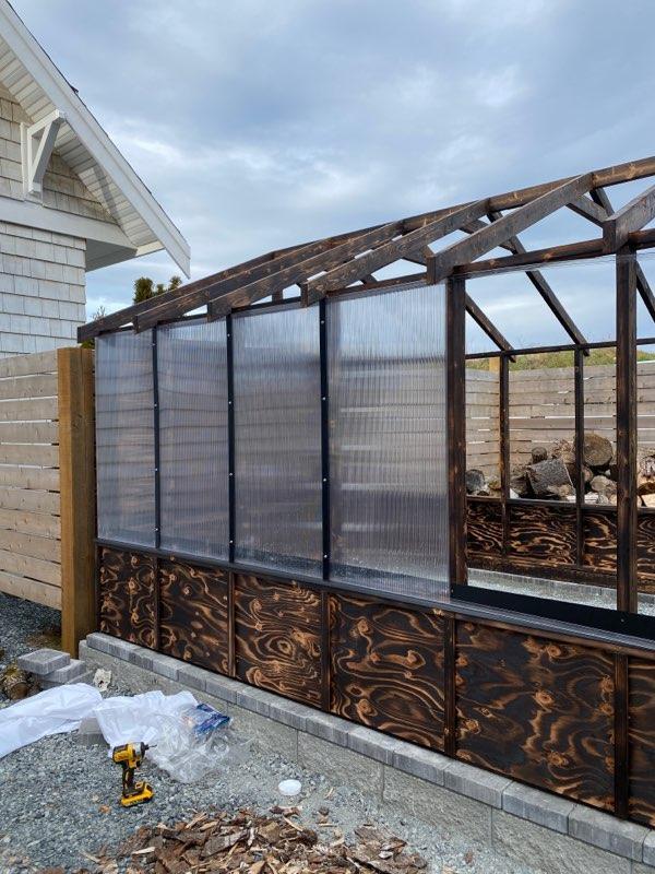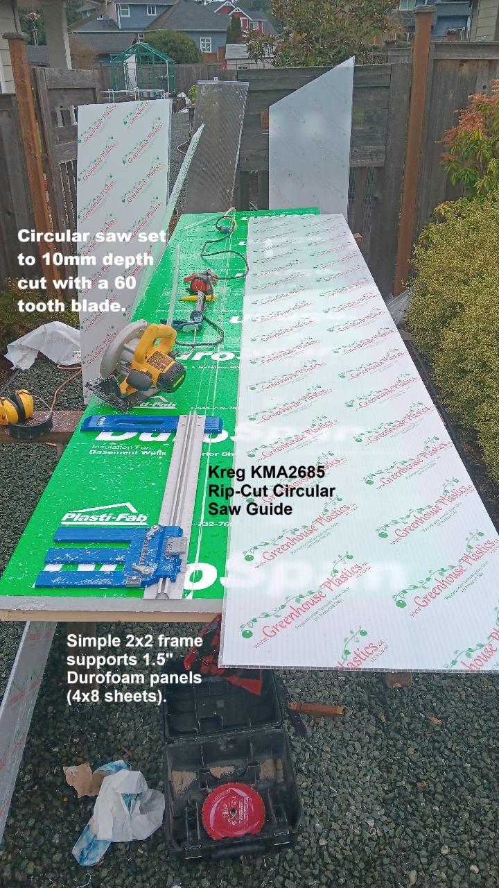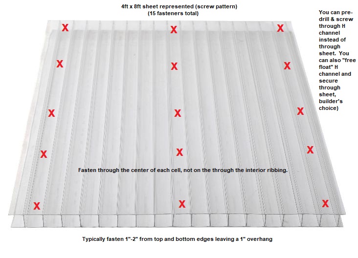 Installation Tips And Best Practices by Frank. Any questions, call or text 8am to 8pm daily (250) 888 9982. 1. Polycarbonate twinwall is easy to cut with a circular saw using a fine tooth blade (40-60 tooth or better). For accurate long cuts, we like to use a Kreg KMA2685 Rip-Cut Circular Saw Guide (up to 24" widths only) on a styrofoam table frame we place on saw horses (see image). The Kreg KMA2685 Rip-Cut Circular Saw Guide on that styrofoam platform fully supports the sheet and accurately cuts long panels down to size (set your curcular saw depth to 10mm on the foam table). You can make a foam platform for about $70 or borrow mine if you are close enough. For straight, cross, rip & angled cuts, another good tool is a Kreg KMA2700 Accu-Cut Circular Saw Track. A table saw works if you are cutting panels out from short sections but handling full size sheets requires support and maybe two people. You can use a jig saw with a metal blade for holes and windows. Use tin snips for U channel and a hack saw with a metal blade for H (a compound mitre saw is better but you need a 40 or 60 tooth blade there too). Use high quality eye protection when cutting polycarbonate! 1A. Cross cutting can often leave white polycarbonate particulates in the cells of the sheet unless your circular saw is equipped with a vaccuum. You can use either a shop vaccuumto draw out particulates if the sheet panels are long or, with shorter panels, an air compressor to blow them out the other side. It's an extra step but most of the time it's quick enough. It's nice to have completely clear panels! 2. Our polycarbonate twinwall has a masking on BOTH sides. Remove both sides after cutting. IMPORTANT: The GREENHOUSEPLASTICS.ca logo masking side is the UV protected side. This must face UP, toward the sun. When you remove the masking, mark the UV side with a strip of green painter's tape temporarily, removing it after you have laid the correct side down. 3. H channel joins sheets on a roof and they do not leak (no H channel required for side walls but battens do look good as per the image below). U channel caps only the 4ft ends of each sheet so that insects do not find their way inside. You can also use aluminum tape at the top of your sheet if it is hidden but it is advised that you use U channel at the bottom as you will need to drill a weeping hole every 6-12 inches at the bottom of a cell in order to allow condensation to escape laterally through the U channel. ![]() 4. The maximum roofing joist spacing is 24 inches. Every second rafter should be moved over 9/16 inch in order for H channel to fall centered on every second rafter. H channel must be on the rafter unless you have purlins. If you already have a roof and you do not want to move rafters, you can strap the roof every 24 inches (purlins) and then place your roof on top of that. 5. Cut your H channel joiners approx 1.5in. short, so U channel end caps can go on in continuous lengths. This provides good surface compression strength especially at the eve of your roof where snowload can exert enough pressure to tear off your U channel. Add a small bead of silicon here for additional adhesion. 6. A simple way to install H channel is to FIRST secure your sheets to the roof through the center of each sheet remembering to leave a 9/16 inch gap between sheets. Make yourself 2 spacers to make sure you have the correct width at the top and bottom and make sure your panel is set square to your structure. Then, lubricate your H channel using warm water and dish soap and starting from the eve of the roof, slide your H channel between the two sheets. As you get most of the H channel on, use a rubber mallet to tap the remaining section onto your roof as it will get more difficult the higher you go. 7. Sheets are secured to your roof using metal roofing screws with the neoprene washer built in. These are available at Home Depot, Home Hardware or Rona. Select the 1 1/2 inch length min.. They come in black, white and galvanized colors. Don't forget to pickup a nut driver for your drill and a drill bit for pre-drilling your holes. ![]() 8. Pre-drill mounting holes. For example, if it is a #6 screw, bore a #8 hole for expansion and contraction. Do not compress the sheet as you fasten (no depressions). Secure your screws flush with the material face ensuring your washer is covered. 9. A 4ft x 8ft sheet, for example, will have 15 fasteners (see image below). 3 at the zero mark (1 or 2 inches from the start point), then 3 more at 2ft, 4ft, 6ft and finally the end of the sheet. A 4x10 sheet will have 18 fasteners, a 4x12, 21 and a 4x16 will have 27. Buy extra screws just in case you lose 1 or 2. You can drill through the center of the H channel. ![]() 10. You can shingle polycarbonate twinwall. Thus, if you want to span 24ft, use a 16ft sheet and a 10ft sheet, overlapping the bottom course by at least 6 inches. (This is better economy than buying 24ft sheets which are not readily available due to the cost of shipping these lengths). Finally, silicon the bottom edge to avoid water and debris ingress under the shingle joint. This will keep things clean. 11. Polycarbonate twinwall is designed to form a radius over the length of the sheet, for example, a 4x12ft sheet can form a 6ft radius. Similarly, H channel joiners are designed to do the same. The image below is a customer supplied photo, just off Shelbourne St. in Victoria. ![]() Recommended Tools: *Circular saw, 40-60 tooth fine blade (For long cuts use Kreg KMA2685 Rip-Cut Circular Saw Guide). (For straight, cross, rip & angled cuts use a Kreg KMA2700 Accu-Cut Circular Saw Track). *Jig saw, metal blade (holes and windows) *Chop saw or metal hack saw for cutting H channel *Tin snips for cutting U channel *Drill with stop *Nut driver *Drill bit *Rubber mallet *2 x 9/16 inch spacers of any type *Gloves for material handling (edges are sharp! NEVER slide hands across the factory or cut edges!) *Caulking gun with 100% Silicon (only 100% S
